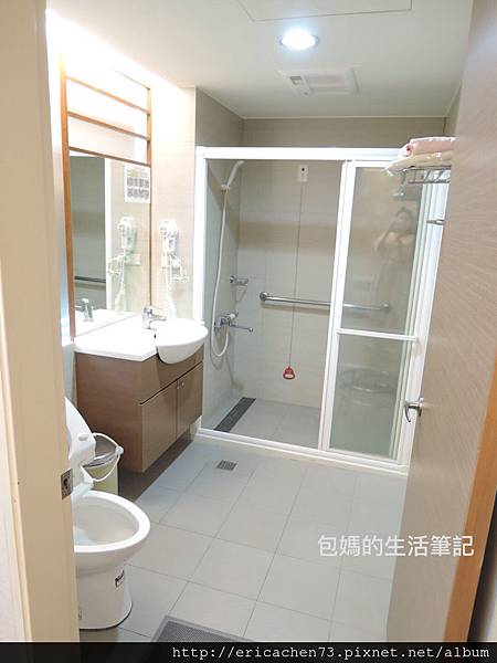 台安月子中心ㄧ景-洗手間是乾濕分離、有暖氣,對於剛生產完頭部要保暖的馬迷來說很重要,有看到淋浴間裡的鐵架嗎?那是拿來放泡盆的,因為自然產產後媽咪要坐浴才可以讓傷口比較快好,因此這個鐵架是讓剛生產完的馬迷泡傷口的。